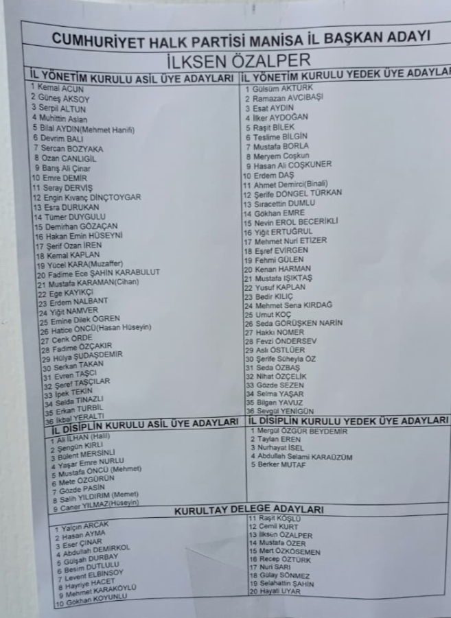 Cumhuriyet Halk Partisi (CHP) Manisa İl Başkanlığı kongresinde İlksen Özalper’in yönetim listesi açıklandı. Listede il yönetim kurulu asil ve yedek üyelerinin yanı sıra, il disiplin kurulu ve kurultay delegeleri de yer aldı.