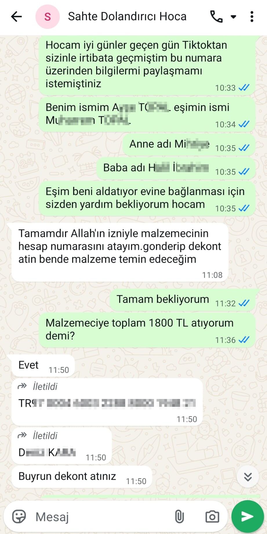 Dolandırıcıların vatandaşlardan yüksek miktarda para talep ettiğini belirten Yılmaz, mağduriyet yaşadığını söyledi. Yılmaz, “Benim hesabım olmamasına rağmen resimlerimi kullanarak yüksek takipçili TikTok hesapları açmışlar. Vatandaşa dini hassasiyetleri kullanarak ‘ayrılanları bağlıyoruz’ gibi ifadelerle mesajlar atmışlar. Vatandaştan bin 800 TL malzeme parası, 2 bin 500 TL de muska parası istemişler. Beni mağdur ettiler” dedi.