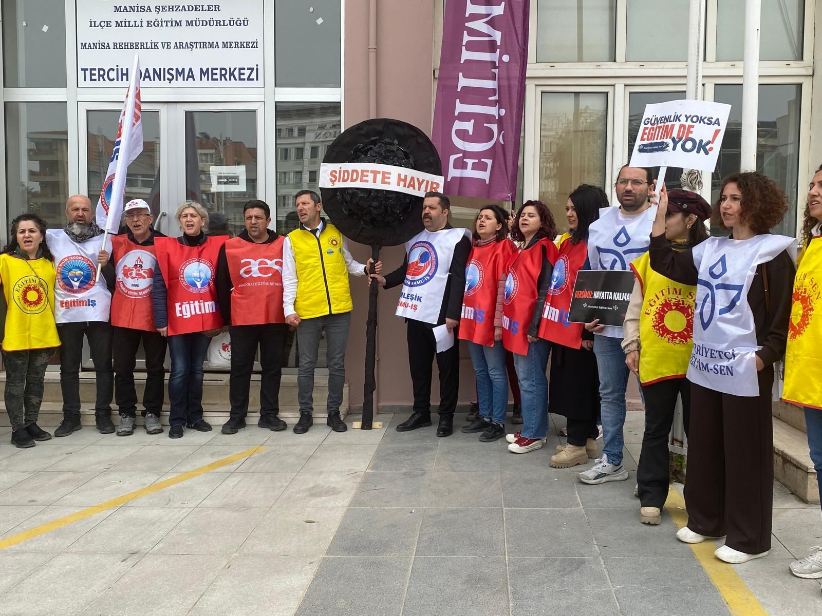 Yürüyüşün ardından Şehzadeler İlçe Milli Eğitim Müdürlüğü önüne gelen eğitimciler, “Yusuf Tekin istifa!” sloganları eşliğinde siyah çelenk bıraktı.