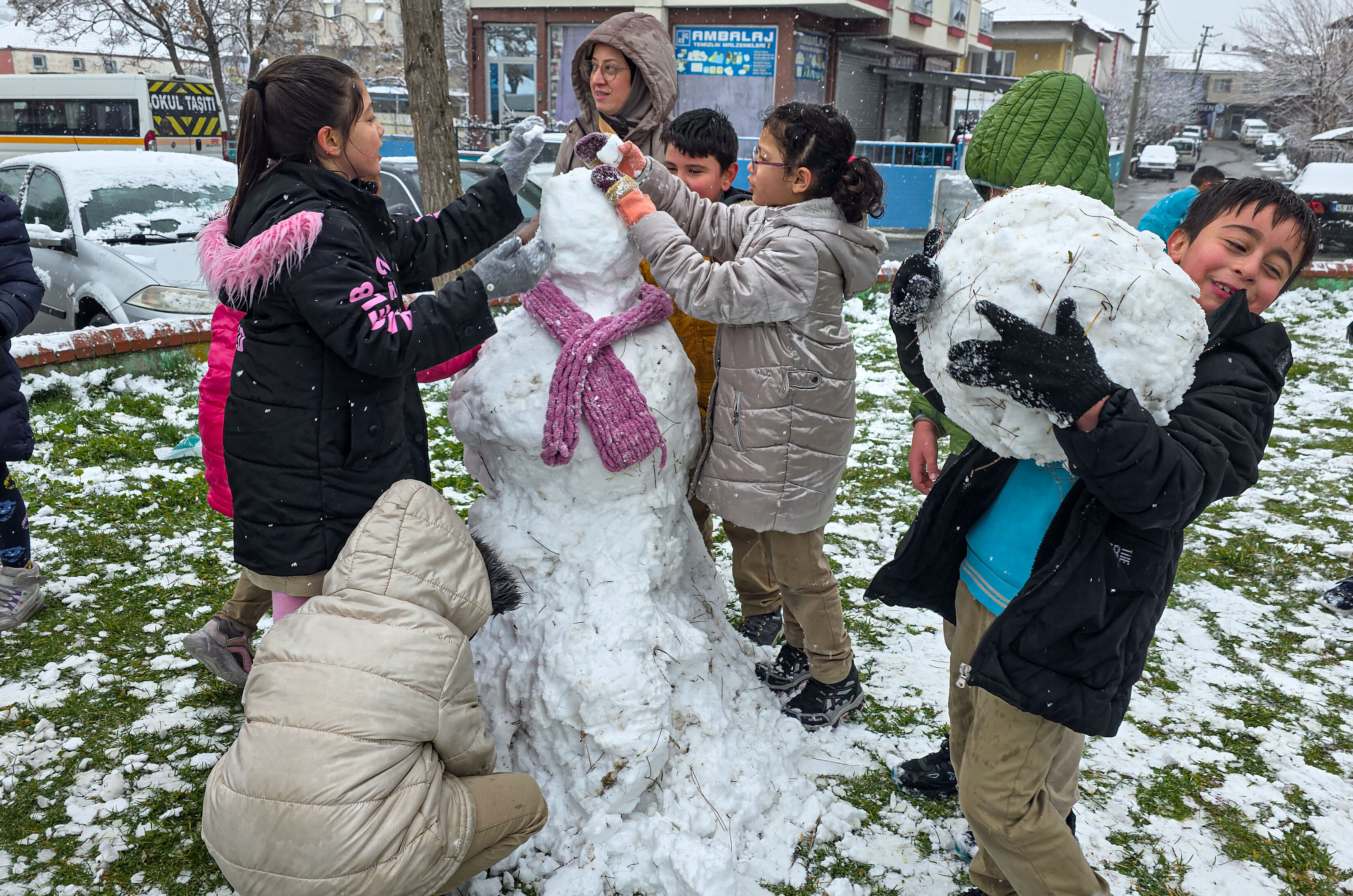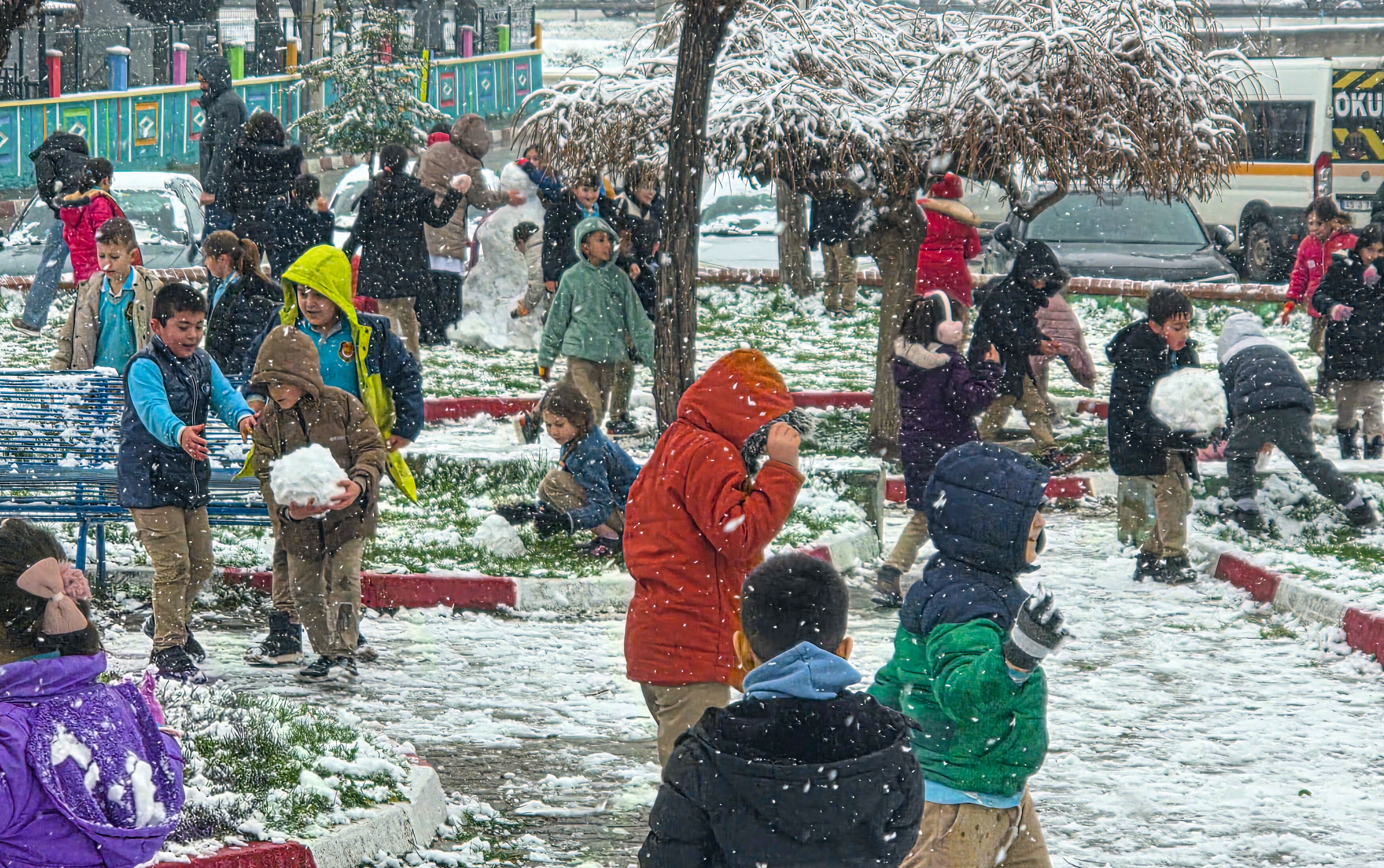 Güne karla uyanan çocuklar, sokaklarda ve okul bahçelerinde kar topu oynayarak eğlendi. Rafet Üçelli İlkokulu öğrencileri teneffüste öğretmenleriyle kar topu oynayıp kardan adam yaptı.