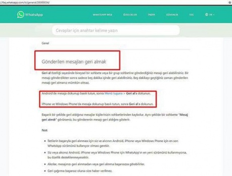 Dün kendi sitesinde sıkça sorulan sorular sayfasını güncelleyen ancak daha sonra sayfayı kaldıran Whatsapp; iPhone, Android ve Windows Phone cihazlarında gönderilen bir mesajın nasıl geri alınacağını açıkladı. SSS - Sıkça Sorulan Sorular sayfasındaki bilgilere göre Geri Al özelliği ile bir grup veya bireysel mesajlaşma ekranında gönderilen mesajı geri almak mümkün.