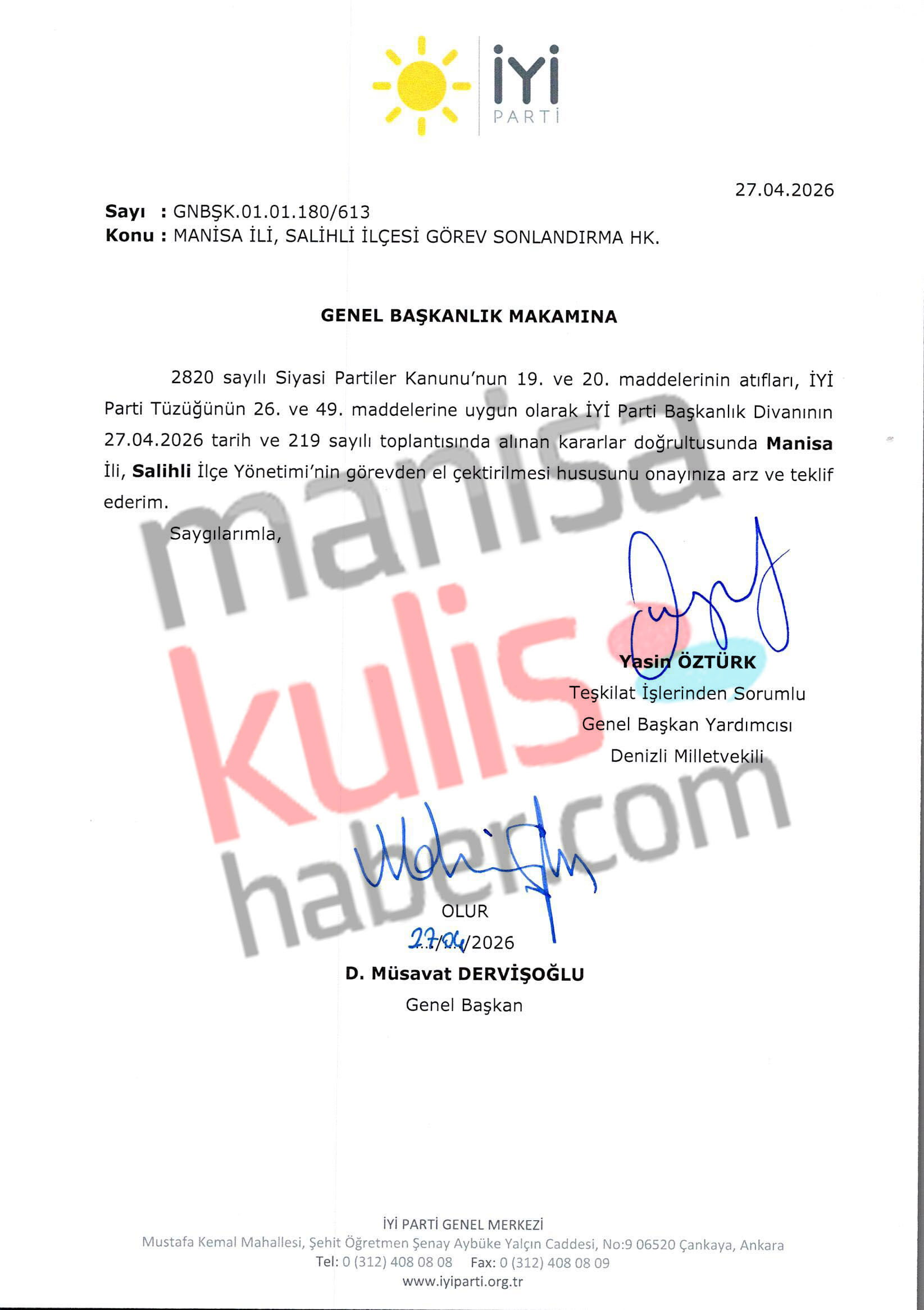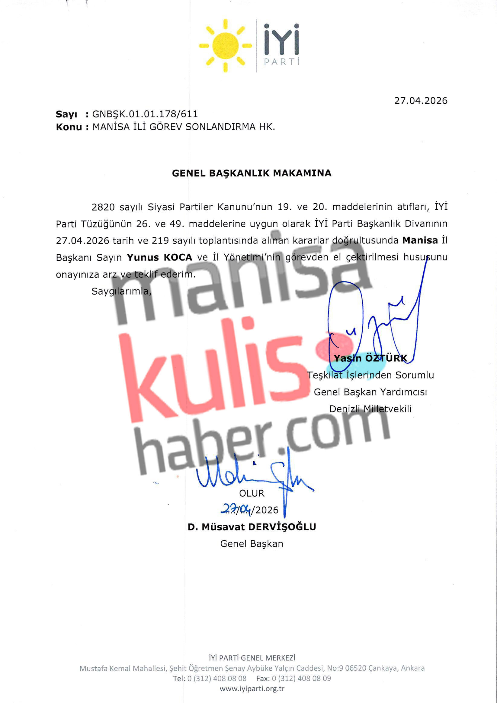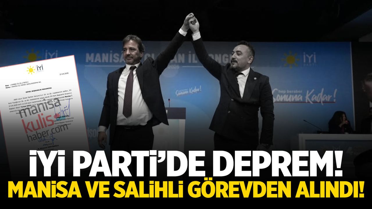 İYİ Parti’de Manisa teşkilatında önemli bir gelişme yaşandı. Parti Başkanlık Divanı’nın 27 Nisan 2026 tarihli ve 219 sayılı toplantısında alınan karar doğrultusunda Genel Başkan Müsavat Dervişoğlu'nun imzasıyla Manisa İl Başkanı Yunus Koca ve il yönetimi görevden alındı.