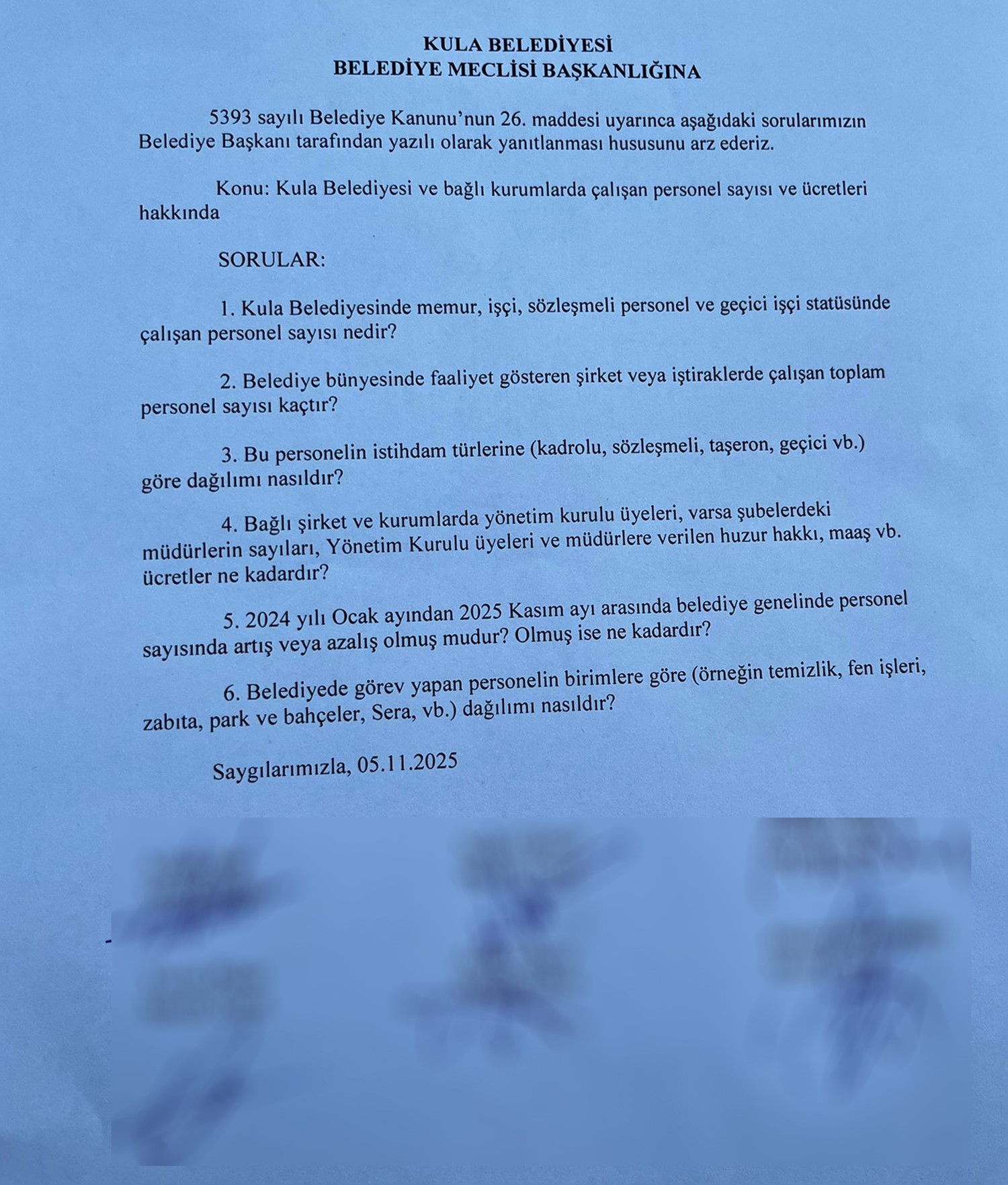 Cumhur İttifakı meclis üyeleri ise, "Kula Belediyesi'nde kimlerin, hangi görevde, ne kadar süredir çalıştığını bilmek her vatandaşın hakkıdır. Şeffaf yönetim anlayışı bunu gerektirir. Belediyede personel sayısının arttığı, bazı isimlerin farklı birimlerde görev almadan maaş aldığı yönündeki iddialar halk arasında konuşuluyor. Başkan bu söylentilere son verecekse, tek yolu açık ve net cevap vermesidir. Vatandaşlar, belediyede çalışan personel sayısının ve görev dağılımının açıklanmasını bekliyor" ifadelerine yer verdi.