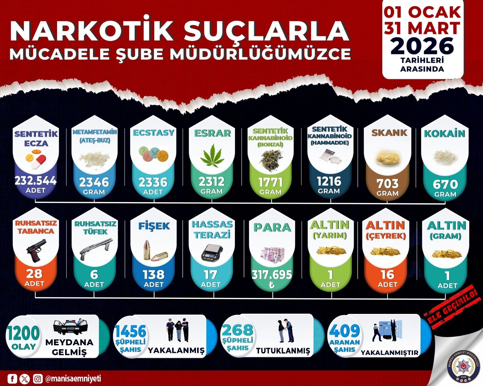 Manisa İl Emniyet Müdürlüğü Narkotik Suçlarla Mücadele Şube Müdürlüğü koordinesinde, Akhisar, Salihli, Soma ve Turgutlu narkotik ekiplerinin de katılımıyla il genelinde 01 Ocak-31 Mart 2026 tarihleri arasında uyuşturucu madde ticareti yapan, aracılık eden, nakleden ve bulunduran şahıslara yönelik çalışmalar yürütüldü.