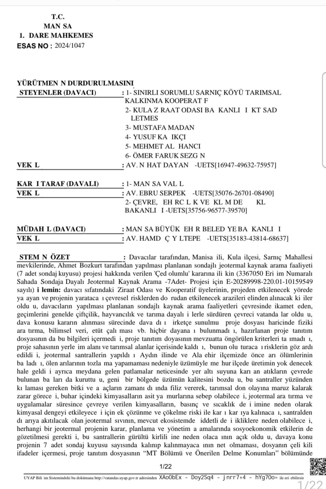 Sarnıç köyü halkı, Kula Ziraat Odası ve Tarımsal Kalkınma Kooperatifi, MASKİ içme suyu havzasına yakın bölgede açılması planlanan 7 jeotermal sondaj kuyusuna karşı dava açtı. Manisa Valiliği’nin davalı olarak yer aldığı davada mahkeme süreci, çevresel riskler ve yerel halkın su hakkı gündeme getirildi.
