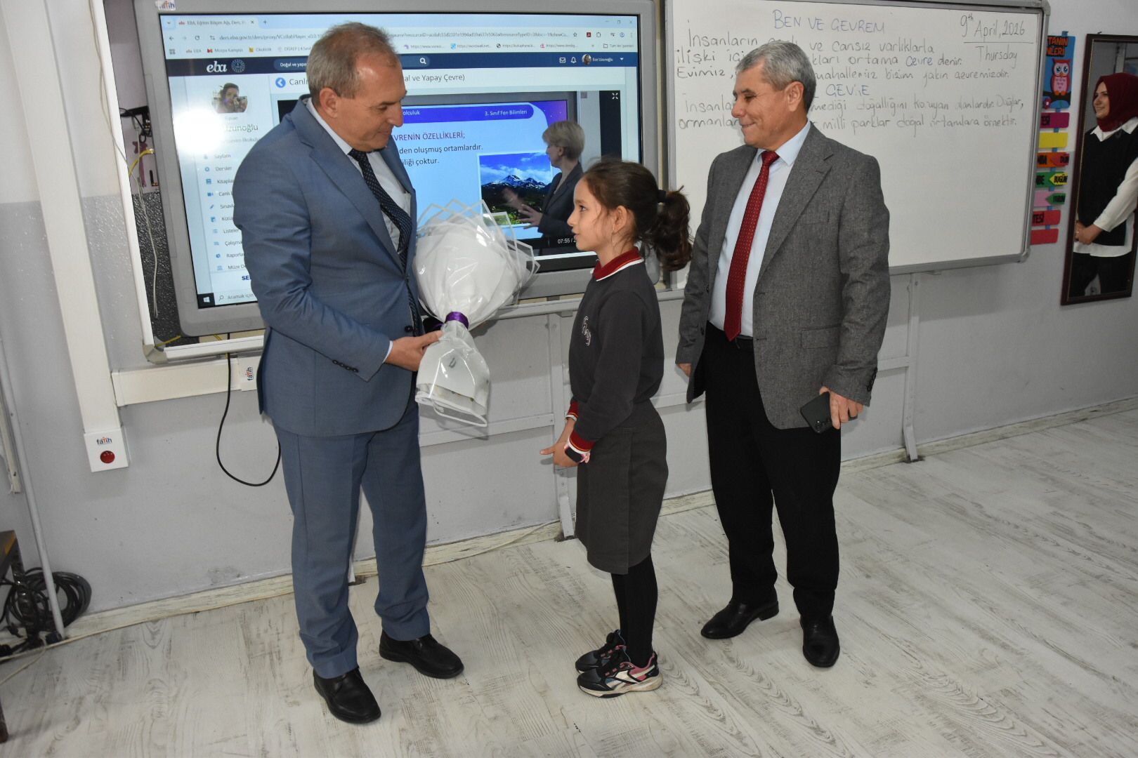 Defne Yüceel, süreci şu sözlerle anlattı: “Başkanlık seçiminde arkadaşlarım çeşitli vaatlerde bulunurken ben de İlçe Milli Eğitim Müdürümüzü sınıfımıza getireceğime söz verdim. Seçildim ve sözüm yerine geldi. Kendisine sınıfım ve okulumuz adına teşekkür ediyorum.”