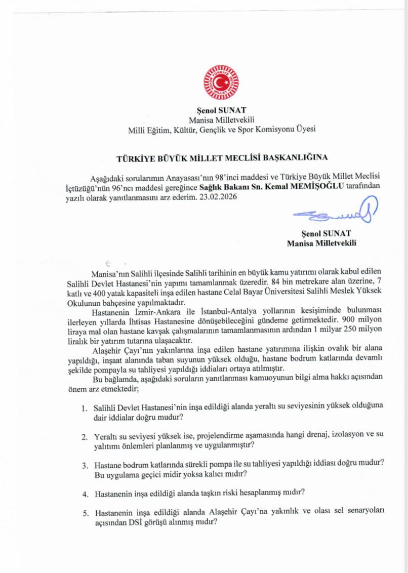 Hastanenin Alaşehir Çayı’na yakın, ovalık bir alanda inşa edildiği; bölgede taban suyunun yüksek olduğu ve bodrum katlarda sürekli pompa ile su tahliyesi yapıldığı yönünde çeşitli iddiaların bulunduğunu belirten Sunat, bu hususların açıklığa kavuşturulması gerektiğini ifade etti.
