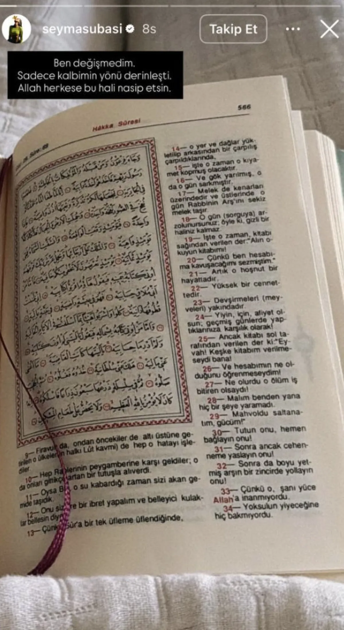 Gündeme oturan son paylaşımında Kur’an-ı Kerim okuduğu anları yayınlayan Subaşı, gönderisine, “Ben değişmedim; sadece kalbimin yönü derinleşti. Allah herkese bu hali nasip etsin.” notunu düştü.
